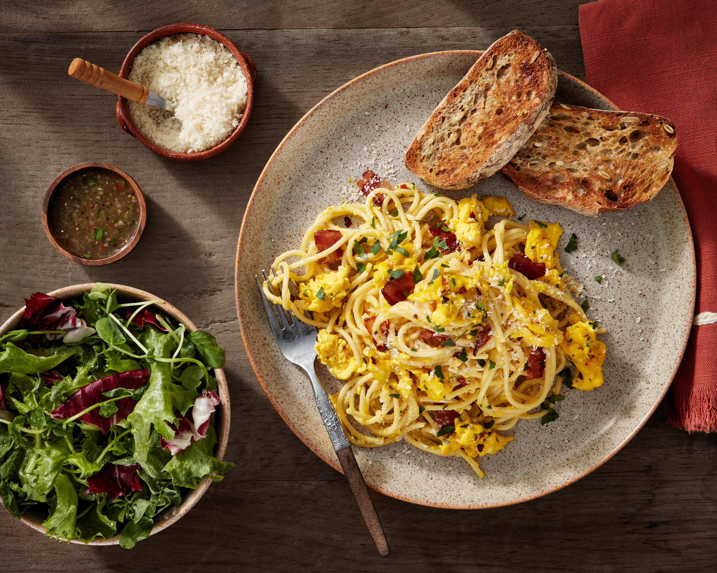 Garlic Parmesan Spaghetti with Bacon & Egg